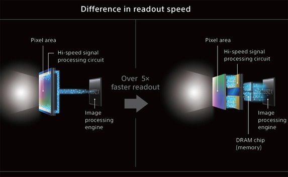 Das Highlight der Kamera ist der neue Bildsensor. Dabei handelt es sich um ein Exmor-RS-Modell mit einer Größe von 13,2 x 8,8mm. 20 Millionen Bildpunkte finden auf dem Bildwandler Platz, von ISO 64 bis ISO 25.600 reicht die Sensorempfindlichkeit. Das Besondere am Sensor ist dessen gestapelte Bauweise, weshalb dieser als „Stacked Sensor“ bezeichnet wird. Dadurch ist unter anderem eine wesentlich schnellere Datenübertragung zum Bildprozessor möglich, weshalb der Sensor mehr als fünfmal so schnell wie ein vergleichbarer Exmor-R-Chip ausgelesen werden kann. Dies beschleunigt die Sony Cyber-shot DSC-RX10 II in sehr vielen Punkten. Zum einen lässt sich dadurch eine Serienbildrate mit bis zu 14 Bildern pro Sekunde in voller Auflösung realisieren. Zum anderen erlaubt diese Technologie einen elektronischen Verschluss ohne Verzerrungen und mit einer äußerst kurzen Belichtungszeit von 1/32.000 Sekunde.