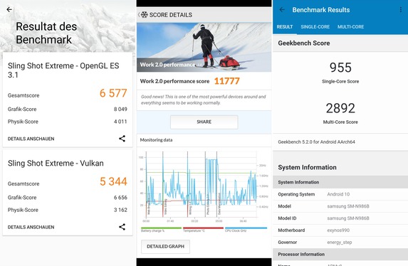 Das Galaxy Note 20 Ultra hat als Smartphone-Flaggschiff eine sehr gute Hardware zu bieten. Der Exynos 990, die Mali-G77 MP11-GPU und der 12GB große Arbeitsspeicher stellen auch bei anspruchsvollen Aufgaben ausreichend Leistung zur Verfügung. Im CPU-Benchmark Geekbench hat das Smartphone nach unseren Messungen Werte von 955 (Single Core) bzw. 2.892 Punkte (Multi-Core) erreicht, beim PC Mark (Work 2.0 Performance) waren es 11.777 Punkte. Damit gehört das Note 20 Ultra zu den besten Modellen. Beim Grafiktest 3D Mark Sling Shot Extreme ergaben sich 6.577 Punkte.