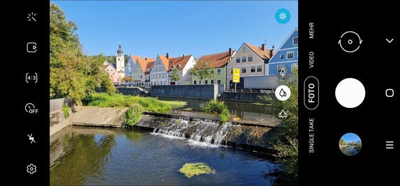 Links von der Liveansicht sind sechs unterschiedliche Einstellungsmöglichkeiten zu finden. Diese ermöglichen die Wahl des Seitenverhältnisses der Bilder, die Aufnahme mit voller Sensorauflösung, das Aktiveren eines Selbstauslösers oder auch das Konfigurieren des LED-Lichts. Am rechten Rand entscheidet man sich für das Aufnahmeprogramm. Des Weiteren hat Samsung hier den Auslöser, die Tasten zum Wechseln zwischen der Front- und den Rückseitenkameras sowie eine Taste zum Aufrufen des Wiedergabemodus positioniert. Die Wahl der Kamera erfolgt mit den im Livebild gelegenen Tasten, per Touch wird zudem fokussiert und die Belichtung gesteuert.