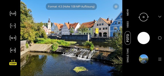 Die Kamera-App des Samsung Galaxy Note 20 Ultra ist gut bekannt, das Design verwendet Samsung bei den meisten seiner höherklassigen Modelle. Unter anderem auch beim Galaxy S20 Ultra, das wir ebenfalls schon testen konnten. Aufnahmen sind wie üblich im Hoch- und Querformat möglich, die App passt sich dementsprechend an. Im Querformat befindet sich die Liveansicht in der Mitte, rechts und links davon sind dann die Bedienelemente platziert. Bei Aufnahmen im Hochformat befinden sie sich entsprechend darunter und darüber.