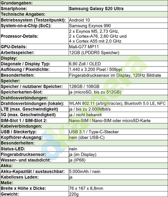 Als Flaggschiff der Serie ist das Samsung Galaxy S20 Ultra natürlich mit der besten aktuell erhältlichen Technik ausgerüstet. Samsung verbaut ein 6,9 Zoll messendes AMOLED-Panel mit der sehr hohen Auflösung von 3.200 x 1.440 Pixel. Das ergibt eine Pixeldichte von 509 ppi. Gorilla Glass 6 sorgt für eine hohe Widerstandsfähigkeit, die Wiedergabe mit bis zu 120 Hz für eine sehr flüssige Darstellung (bei reduzierter Auflösung). Der SoC vom Typ Samsung Exynos 990 verfügt über zwei Exynos M5-Kerne mit 2,73 GHz, zwei Cortex-A76-Kerne mit 2,60 GHz und vier Cortex A55-Kerne mit 2,0 GHz. Satte 12GB Arbeitsspeicher und eine Mali-G77 MP11 stehen ebenfalls zur Verfügung. Der integrierte Speicher unseres Testmodells ist 128GB groß, per microSD-Karte lässt sich dieser erweitern. Das kostet allerdings den zweiten Nano-SIM-Slot. Ohne microSD-Karte lassen sich zwei SIM-Karten nutzen. Zu den Drahtlostechnologien gehören unter anderem LTE und 5G, WLAN (802.11 (a/b/g/n/ac/ax), Bluetooth 5.0 LE sowie NFC. Zur Positionsbestimmung ist unter anderem GPS vorhanden. Im 76 x 167 x 8,8mm großen Gehäuse mit Abdichtungen (IP68) hat Samsung einen 5.000mAh starken Akku untergebracht, dieser lässt sich per Kabel oder drahtlos aufladen. Das S20 Ultra bringt 220g auf die Waage, die Datenübertragung zu einem Computer  erfolgt per USB-C (3.1.).