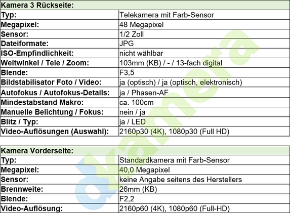 Als Ultraweitwinkelkamera kommt ein Modell mit etwa 1/2,55-Zoll großem Sensor und mit 12 Megapixel zum Einsatz. Das Objektiv besitzt eine kleinbildäquivalente Brennweite von 13mm und eine Lichtstärke von F2,2. Das Verändern des Fokus wird nicht unterstützt, das gesamte Bild ist jedoch auch so immer scharf. Bei der Telekamera kommt ein 48 Megapixel-Chip der 1/2-Zoll-Klasse zum Einsatz. Die Aufnahmen erfolgen mit 12 Megapixel (4 zu 1-Pixel-Binning), das stabilisierte Objektiv mit 103mm KB-Brennweite besitzt eine Blendenöffnung von F3,5. Als Frontkamera wurde ein 40-Megapixel-Modell mit 26mm Brennweite und F2,2-Blende verbaut.