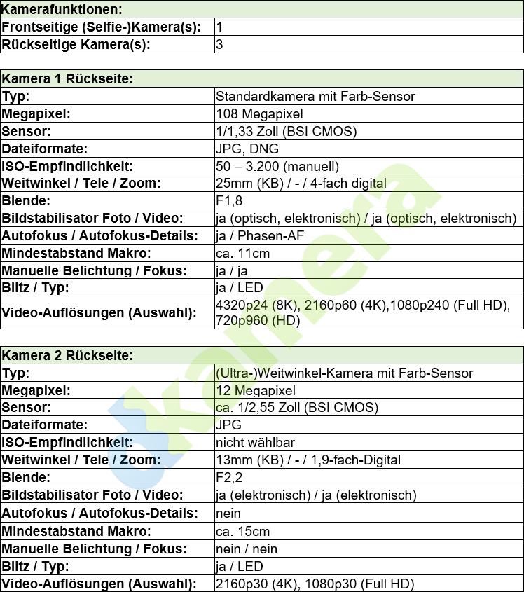 Kameras hat Samsung insgesamt fünf an der Zahl verbaut. Auf der Rückseite liegen vier davon, nur drei lassen sich allerdings ansteuern. Die vierte Kamera speichert als Tiefenkamera Abstandsinformationen, diese werden unter anderem zur künstlichen Bokeh-Berechnung verwendet. Bei der Hauptkamera setzt Samsung auf einen sehr großen und hochauflösenden Sensor (108 Megapixel; 1/1,33 Zoll). Wie mittlerweile üblich werden mehrere Pixel zu einem großen Bildpunkt zusammengelegt, die standardmäßige Auflösung beträgt daher 12 Megapixel (Nonacell-Technologie mit 9 zu 1 Pixel-Binning). Die Brennweite des Objektivs liegt bei 25mm (KB), die Lichtstärke bei F1,8. Des Weiteren sind die optische Stabilisierung und ein Phasendetektions-AF zu nennen.