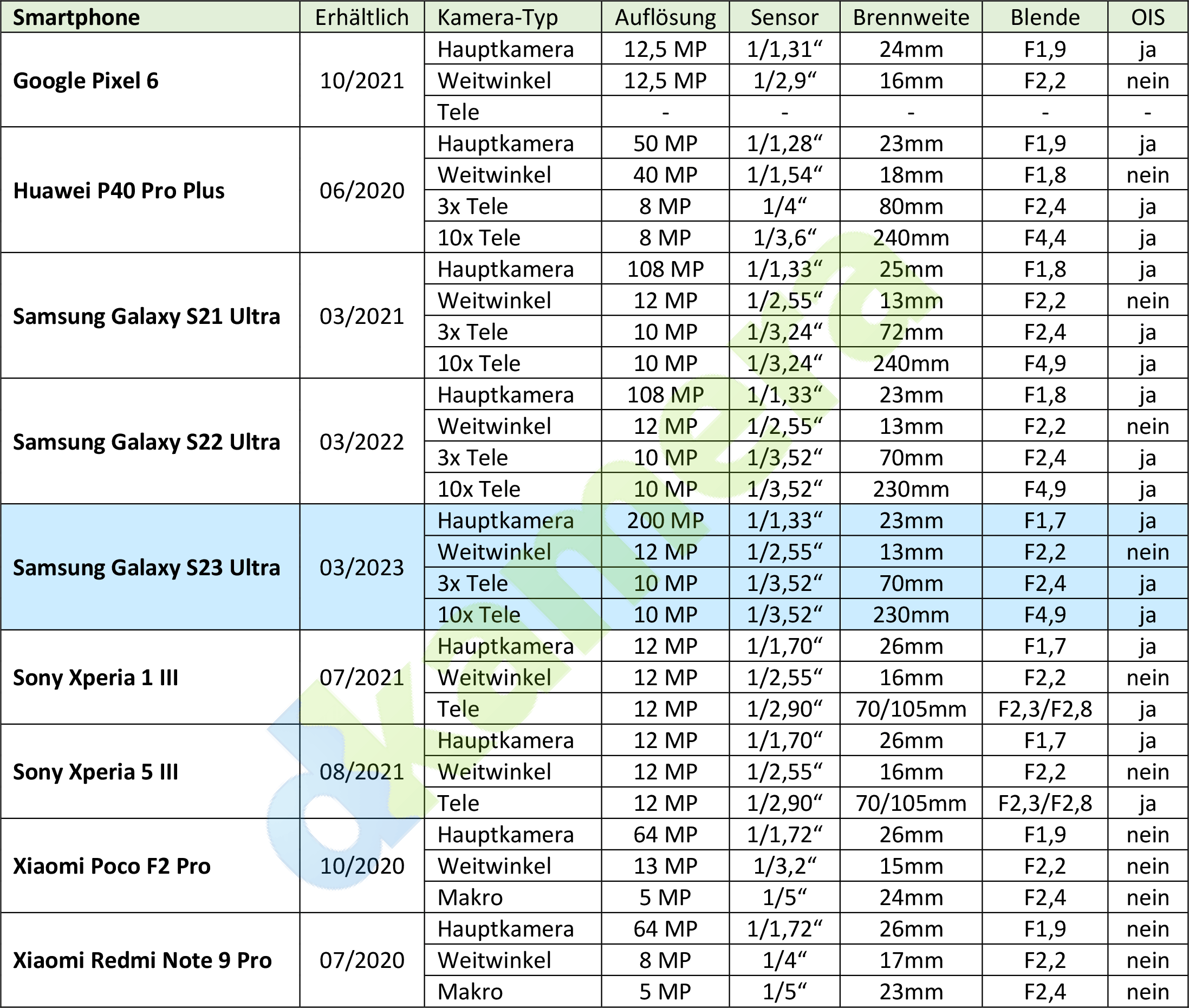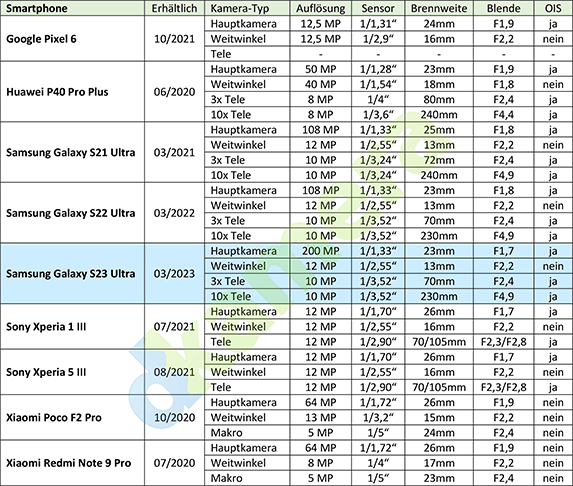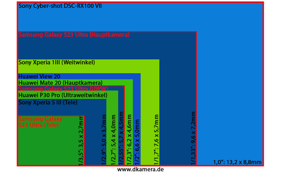 Freunde von Ultraweitwinkelbildern kommen beim Samsung Galaxy S23 Ultra natürlich nicht zu kurz. Die Festbrennweite wird mit 13mm (KB) und einer Lichtstärke von F2,2 angegeben. Der genutzte Sensor sollte zur 1/2,55-Zoll-Klasse gehören und löst zwölf Megapixel auf. Zur Aufnahme weiter entfernter Motive bringt das Smartphone zwei Telekameras mit. Der Bildwinkel der ersten Telekamera entspricht auf Kleinbild umgerechnet einem 70mm-Objektiv, bei der zweiten Telekamera sind es 230mm. Ersteres Modell besitzt einen klassischen optischen Aufbau und eine Blende von F2,4, die zweite Telekamera mit einer Lichtstärke von F4,9 wird in der Periskop-Bauweise gefertigt. Nur dadurch ist es möglich, eine Optik mit 27mm realer Brennweite in ein lediglich 8,9mm flaches Gehäuse zu integrieren.