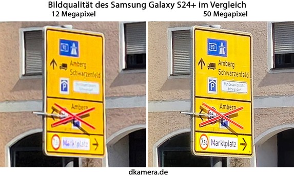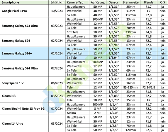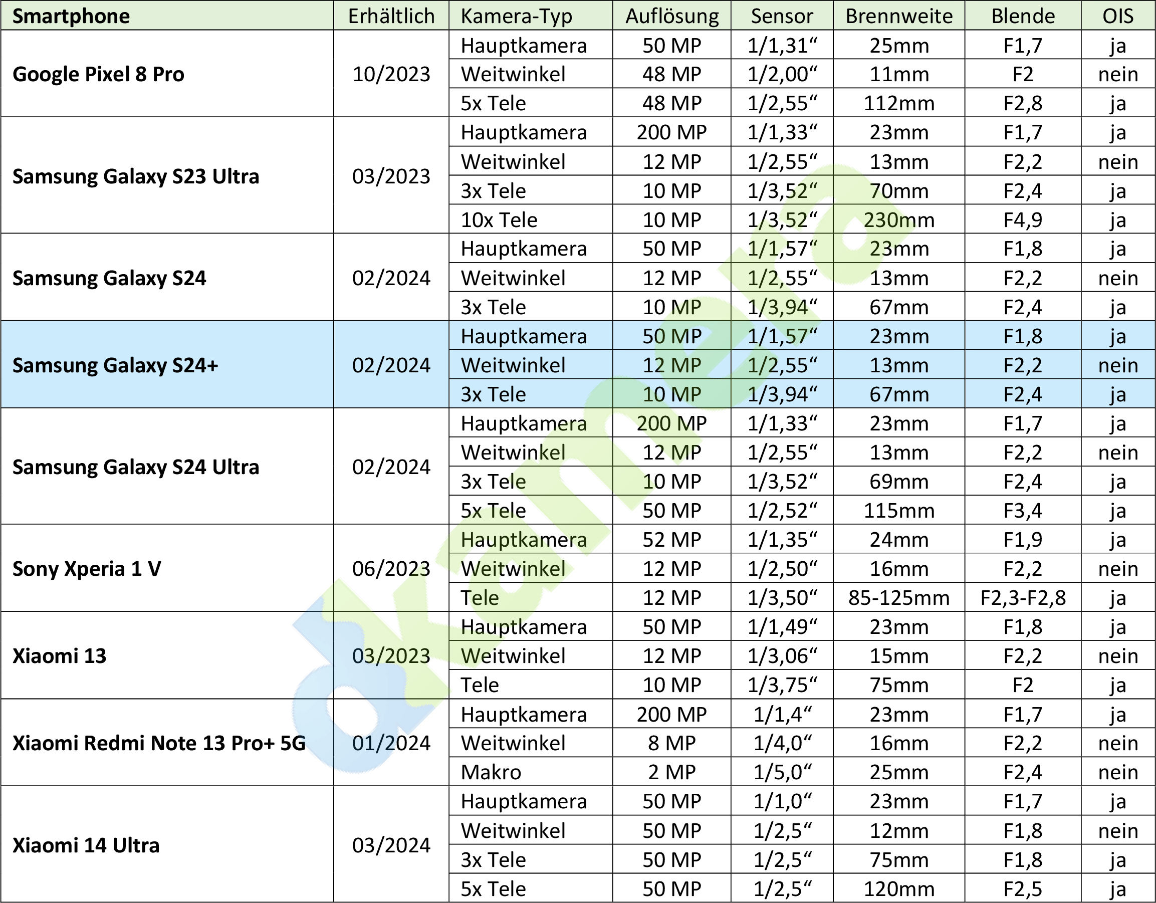 Die Ultraweitwinkelkamera des Samsung Galaxy S24+ speichert Bilder mit zwölf Megapixel, als Bildwandler kommt ein 1/2,55-Zoll-Sensor (IMX564) zum Einsatz. Das Objektiv wird mit einer KB-Brennweite von 13mm und einer Blende von F2,2 angegeben. Bei der Telekamera nutzt Samsung einen Sensor der 1/3,94-Zoll-Klasse, dessen Auflösung liegt bei zehn Megapixel. Da im Hintergrund wie üblich bei Smartphones jedoch zahlreiche Berechnungen vorgenommen werden, gibt das S24+ Fotos auch beim Einsatz der Telekamera mit zwölf Megapixel aus (Ausnahme DNG-Dateien).
