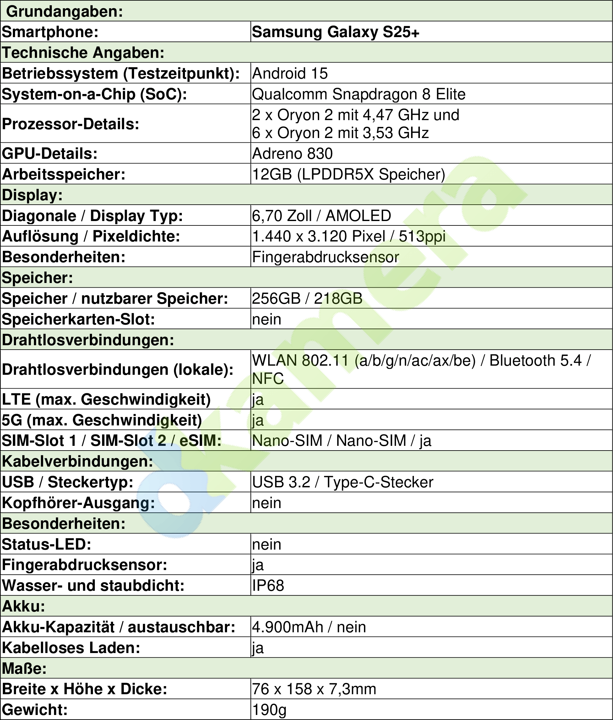 Als mittleres der drei Galaxy-S25-Modelle ordnet sich das S25+ auch größen- und gewichtstechnisch zwischen den beiden Schwestermodellen ein. Es ist 158 x 76 x 7,3mm groß und bringt 190g auf die Waage. Als Display verbaut Samsung ein 6,7 Zoll messendes Dynamic-AMOLED-Modell mit 3.120 x 1.440 Pixel und einer Bildwiederholfrequenz von bis zu 120Hz. Zu den weiteren Spezifikationen gehören eine Pixeldichte von 513ppi und die vollständige Abdeckung des DCI-P3-Farbraums. Als SoC wird der Qualcomm Snapdragon 8 Elite verwendet. Dabei handelt es sich um ein Achtkern-Modell (2 x Oryon V2 Phoenix L mit 4,47GHz sowie 6 x Oryon V2 Phoenix M mit 3,53GHz) mit Adreno 830-GPU. Beim Arbeitsspeicher setzt Samsung unabhängig von der weiteren Speicherausstattung auf 12GB (LPDDR5X), beim Speicher kann man zwischen 256GB und 512GB wählen. Eine Option zum Erweitern gibt es wie heutzutage üblich nicht.