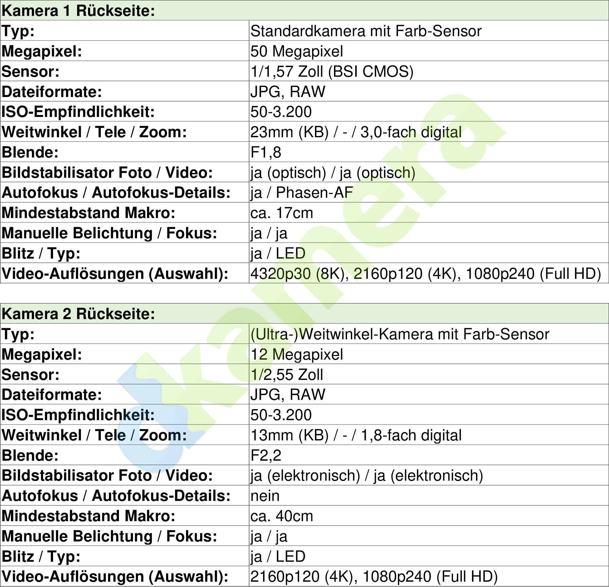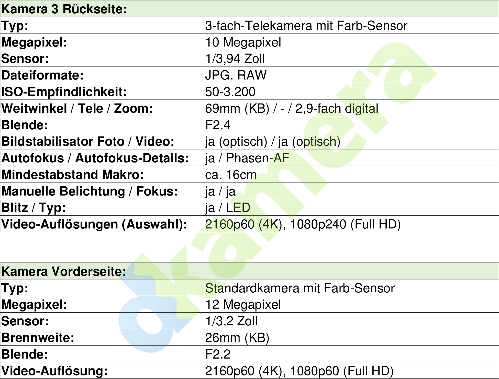 Bei der Ultraweitwinkelkamera verwendet Samsung einen Sensor der 1/2,55-Zoll-Klasse mit zwölf Megapixel. Der Bildwinkel entspricht einem Vollformatmodell mit 13mm und die Lichtstärke liegt bei F2,2. Für die Aufnahme von weiter entfernten Motiven gibt es die 3-fach-Telekamera. Deren Objektiv besitzt eine KB-Brennweite von 69mm und eine Lichtstärke von F2,4. Als Bildwandler wird hier ein zehn Megapixel auflösender Sensor der 1/3,94-Zoll-Klasse verwendet. Wie bei der Hauptkamera steht auch bei der Telekamera ein OIS zur Verfügung.