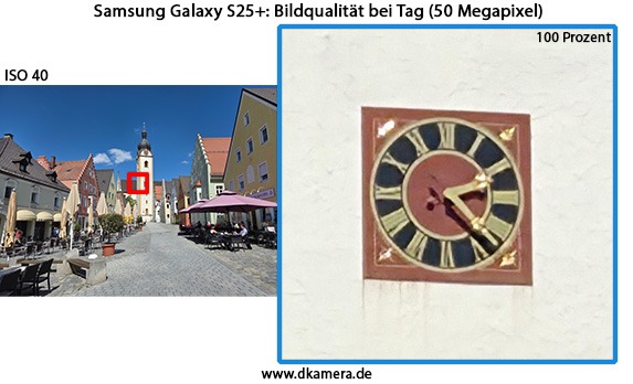 Die Telekamera des Galaxy S25+ sorgt für einen „3-fach-Zoom“, der Bildwinkel entspricht einem Objektiv mit rund 69mm Brennweite. Auch hier kommt ein OIS zum Einsatz, die Lichtstärke liegt bei F2,4. Beim Sensor handelt es sich um ein zehn Megapixel auflösendes Modell der 1/3,94-Zoll-Klasse. Abseits der RAW-Bilder besitzen die Fotos allerdings stets 12 Megapixel. Diese „Auflösungsangleichung“ an die Haupt- und Ultraweitwinkelkamera ist bei Smartphones nicht unüblich.