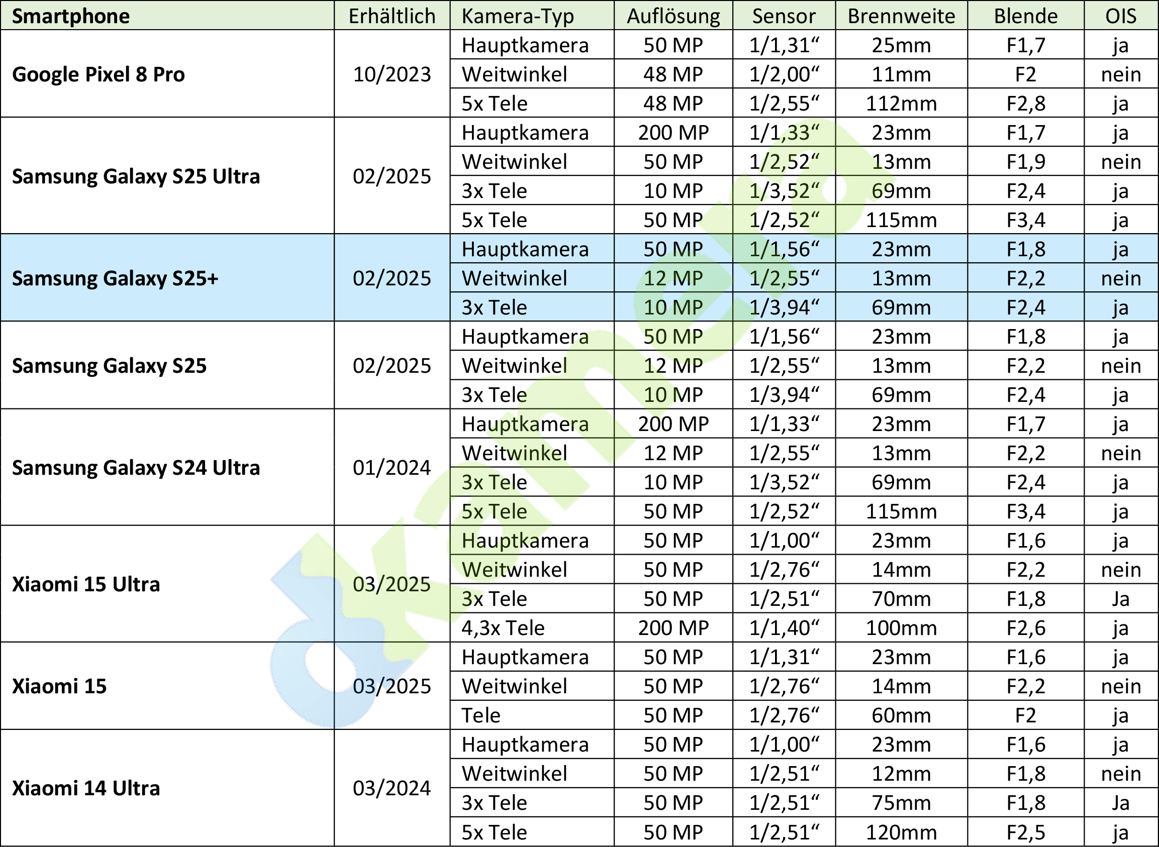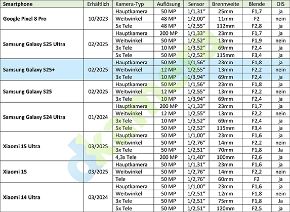 Das 2025er Plus-Modell der S25-Serie kommt dem eigentlichen Flaggschiff S25 Ultra in vielen Punkten nahe. Bei den Kameras hat Samsung den Abstand vom Plus zum Ultra in den letzten Jahren aber immer größer werden lassen. Kamera-Updates, die das Ultra erhalten hat, gab es für das S25+ nicht. Bei der Hauptkamera mit Weitwinkelobjektiv nutzt Samsung weiterhin den ISOCELL GN3 (1/1,57 Zoll) aus dem eigenen Haus. Damit kann man Fotos mit bis zu 50 Megapixel aufnehmen. Des Weiteren wird natürlich auch Pixel-Binning unterstützt, was für eine Auflösung von 12 Megapixel sorgt. Die Bildpunkte fallen in diesem Fall mit 2,0µm doppelt so groß wie bei der maximalen Auflösung (1,0µm) aus. Die kleinbildäquivalente Brennweite des Objektivs liegt bei 23mm, die Lichtstärke bei F1,8 und ein OIS gleicht Verwacklungen aus.