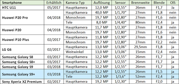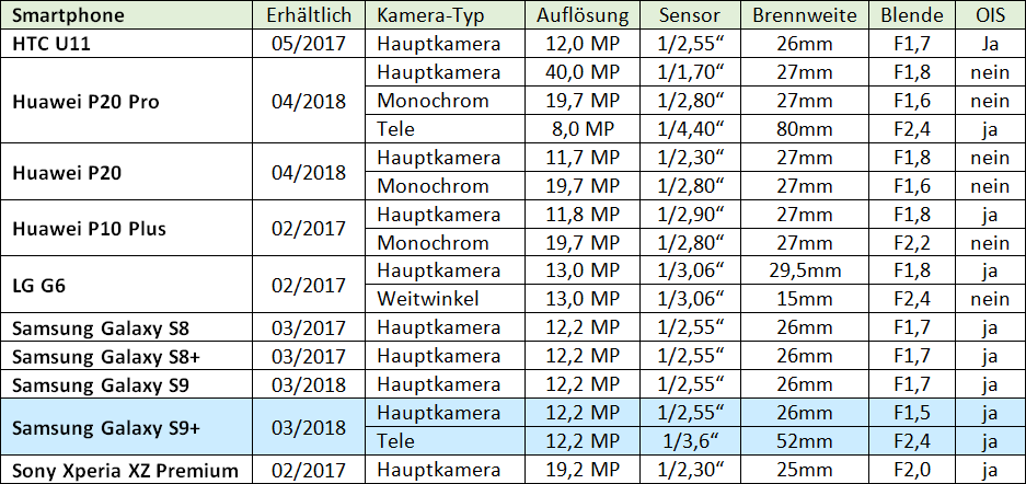 Die Kameras der Flaggschiffmodelle haben bei Samsung schon immer hohe Priorität. Beim Galaxy S9+ gilt das noch mehr als beim S9, obwohl der Hersteller beide Modelle mit „Camera Reimagined“ bewirbt. Die Hauptkameras beider Smartphones fallen völlig identisch aus, das S9+ besitzt zudem noch eine zweite Telekamera. Als Bildwandler kommt bei der Hauptkamera ein 1/2,55 Zoll großes CMOS-Modell mit 12,2 Megapixel zum Einsatz. Samsung verwendet hierfür teilweise eigene Sensoren, teils auch Sensoren von Sony.