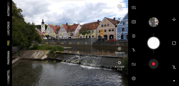Wer eigene Einstellungen vornehmen und die Belichtung bzw. Fokussierung nicht dem Smartphone überlassen möchte, wechselt zum Pro-Modus. Dieser erlaubt das Verändern der Belichtungskorrektur (-/+ zwei Blendenstufen), des Weißabgleichs („Automatisch“, „Bewölkt, „Sonnenschein“, ...), des Fokusmodus (AF oder MF), der AF-Messfelder (Mitte oder alle Messfelder), der Belichtungsmessmethode („Matrix“, „Mittenbetont“ und „Punkt“), des Bildstils („Standard“, „Lebendig“, „Sanft“, „Nostalgisch“, ...), der Belichtungszeit (10 Sekunden bis 1/24.000 Sekunde), der Blende (F1,5 oder F2,4) und der Sensorempfindlichkeit (ISO 50 bis ISO 800). Bei Videos lassen sich nur die Belichtung, der Weißabgleich und der Fokus konfigurieren.