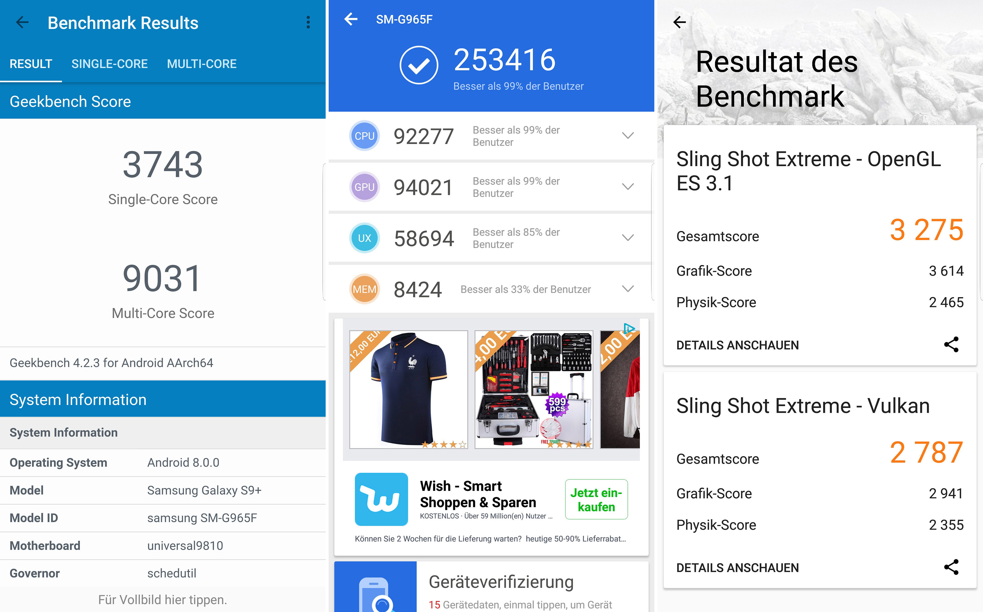 Wir haben folgende Benchmarks mit dem Samsung Galaxy S9+ Smartphone durchgeführt: |