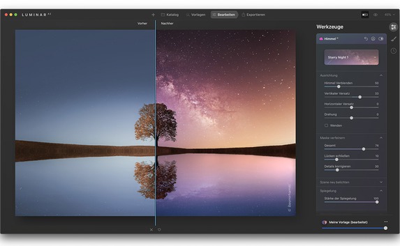 Skylum hat für seine künstliche Intelligenz nutzende Bildbearbeitungssoftware Luminar AI ein weiteres Update herausgegeben. Die Verbesserungen, die auch auf Basis des User-Feedbacks vorgenommen wurden, betreffen unter anderem das Himmel-AI-Werkzeug. Mit diesem kann der Himmel einfach und schnell ausgetauscht werden kann. Neu ist unter anderem die automatische Reflexion des Himmels im Wasser: „Der neue Himmel passt sich automatisch an den Winkel und die Tiefe der Szene an und achtet dabei sogar auf die kleinsten Details, um unglaubliche Ergebnisse zu erzielen.“ Dies verspricht Skylum in der Pressemitteilung.