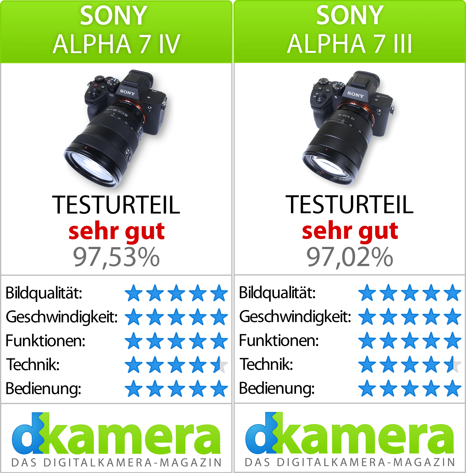 Am Ende können wir zusammenfassen: Die Sony Alpha 7 IV bietet das bessere Gesamtpaket, muss wegen des signifikant höheren Preises und ihrer spezifischen Stärken allerdings nicht für jeden die bessere Kamera sein. Daher gilt es vor dem Kauf zu klären, welche Funktionen man benötigt.