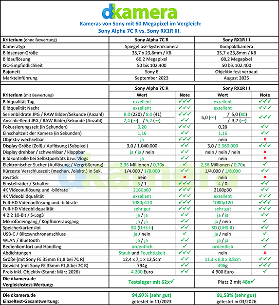 Mit den Modellen der Alpha-7C-Serie bietet Sony schon seit ein paar Jahren sehr kompakte Vollformat-DSLMs an. Diese bieten trotz eines geringeren Gewichts eine hohe Leistung und richten sich vor allem an Fotografen, die möglichst kompaktes Equipment besitzen möchten. Eine ähnliche Zielgruppe spricht auch die Sony RX1R III an. Sonys High-End-Kompaktkamera ist mit dem Sensor der Alpha 7C R ausgestattet, ihr Objektiv lässt sich allerdings nicht wechseln. In diesem Vergleichstest stellen wir beide Modelle gegenüber und klären, welches Modell die bessere Wahl darstellt.