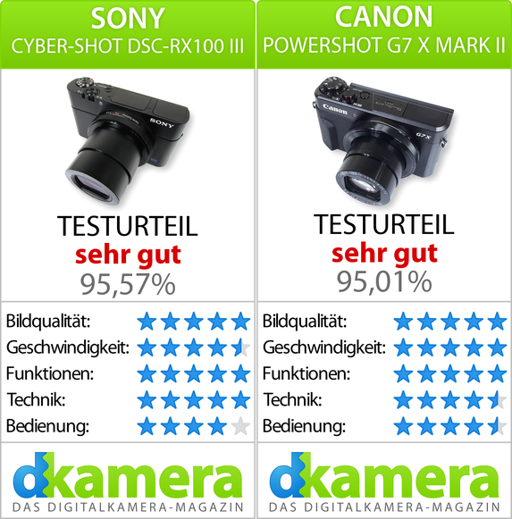 Die Canon PowerShot G7 X Mark II kann gegenüber der RX100 III mit ihrem größeren Zoombereich und der nicht ganz so schnell abfallenden Blendenöffnung punkten, die Abbildungsleistung des Objektivs ist allerdings schlechter. Des Weiteren weiß die Canon-Kamera mit einem schnelleren Autofokus, einer kürzeren Einschaltzeit und einem besseren Handling zu gefallen.