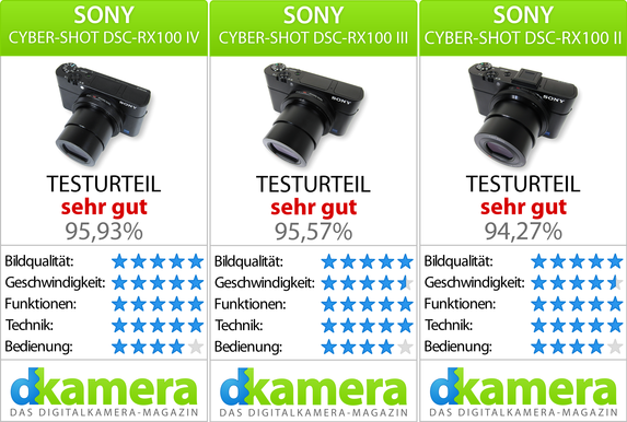 Am Ende dieses Vergleichstests fällt uns das Fazit relativ einfach. Die drei Kompaktkameras der RX100-Serie gleichen sich bei der Fotoqualität, in den meisten anderen Punkten sind sie jedoch sehr unterschiedlich ausgestattet. Als Sieger geht aus unserem Test die Sony Cyber-shot DSC-RX100 IV (Testbericht)