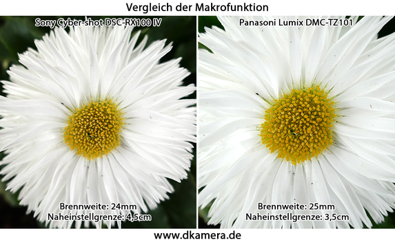 Für Makroaufnahmen sind beide Kameras recht gut geeignet, die Naheinstellgrenzen liegen laut Herstellern bei jeweils 5cm. Diese Werte gelten jeweils für die weitwinkeligste Brennweite. In unserem Test konnte die TZ101 bereits ab 3,5cm Abstand scharfstellen, bei der RX100 IV waren es knapp 4,5cm.