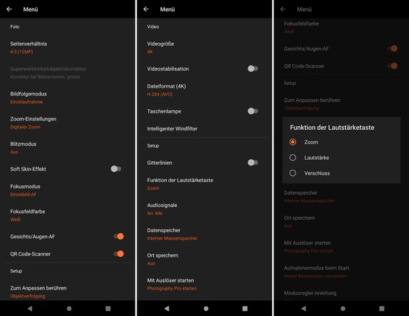 Die Liveansicht muss angesichts der vielen Optionen etwas kleiner als gewohnt ausfallen, das stört uns allerdings nicht. Dadurch sind alle Aufnahmeoptionen jederzeit im Blick. Für weitere Optionen steht ein Hauptmenü zur Verfügung. Hier können Nutzer unter anderem das Seitenverhältnis der Bilder, die Farbe des Fokusfeldes oder die Auflösung der Videos verändert.