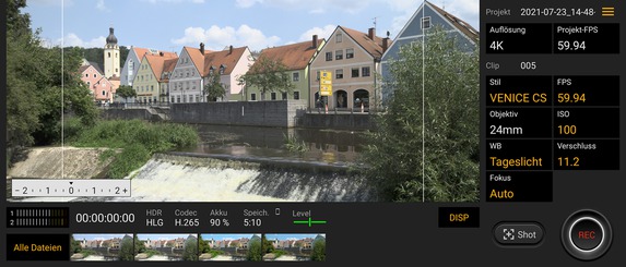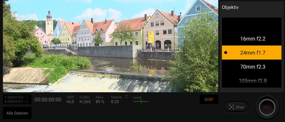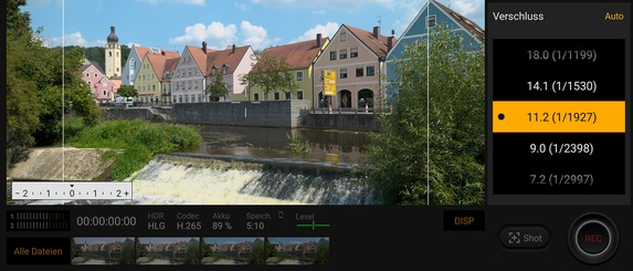 Bei der Cinema-Pro-App können sich Videografen, wie bereits in Teil zwei dieses Testberichts beschrieben, austoben. Zum einen ist es möglich, zwischen einer Reihe von Video-typischen Bildstilen zu wählen. Dazu gehören unter anderem „Venice CS“, „Opak/BU60YE60“ oder „Weich/YE40“. Daneben lassen sich der ISO-Wert, die Verschlusszeit, der Weißabgleich und der Fokusmodus beeinflussen. Die Aufnahmezeit zeigt die Cinema-Pro-App sogar framegenau an, der Pegel der Mikrofonkanäle lässt sich ebenfalls ablesen.