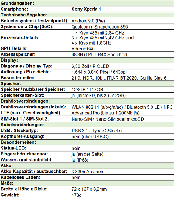 Die technischen Daten des Xperia 1 von Sony sind vielversprechend. Die Hardware des Smartphones ist technisch auf dem neuesten Stand. Als Prozessor kommt ein Qualcomm Snapdragon 855 mit acht Kernen (1 x Kryo 485 mit 2,84 GHz, 3 x Kryo 485 mit 2,42 GHz und 4 x Kryo 485 mit 1,80 GHz) und Adreno 640-GPU zum Einsatz, der Arbeitsspeicher ist 6GB groß.