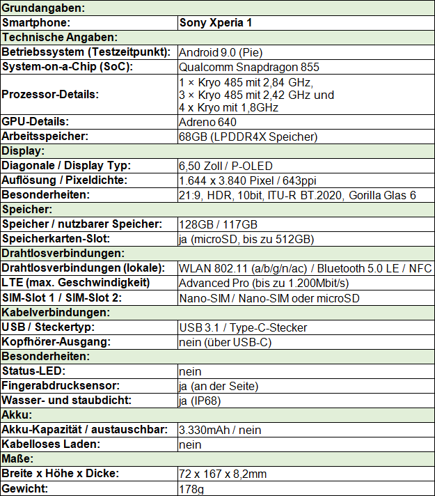 Festspeicher besitzt das Smartphone 128GB, mittels microSD-Karte lässt sich der Speicher erweitern. In diesem Fall fällt allerdings der zweite Nano-SIM-Slot weg. Das P-OLED-Display im 21:9-Format mit einer Diagonalen von 6,5 Zoll löst 3.840 x 1.644 Pixel auf und unterstützt unter anderem die Wiedergabe von HDR-Inhalten.