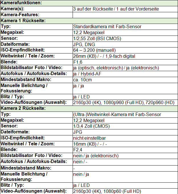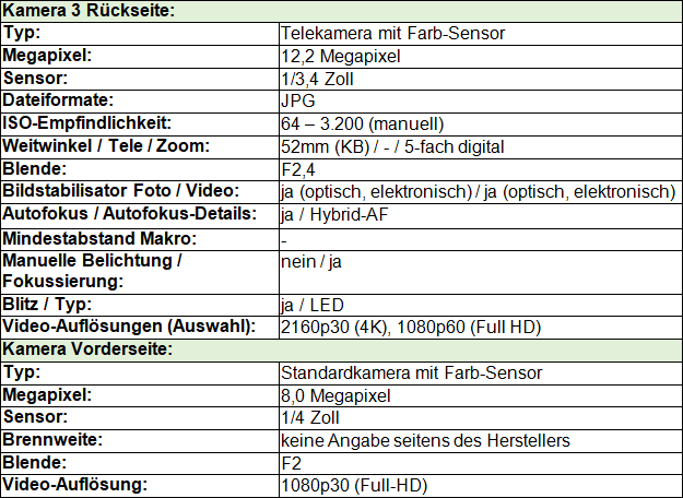 Das Kamera-Setup des Sony Xperia 1 umfasst drei Kameras auf der Rückseite und eine Kamera auf der Vorderseite. Auf der Rückseite stehen eine Ultraweitwinkel- (16mm KB), eine Standard- (26mm KB) und eine Telekamera (52mm) zur Verfügung. Effektiv entspricht das einem 3,3-fachen Zoombereich. Die Bildwandler lösen jeweils 12,2 Megapixel auf, besitzen aber unterschiedliche Abmessungen. Die Blende der Ultraweitwinkellinse liegt bei F2,4, die der Weitwinkellinse (= Hauptkamera) bei F1,6 und die der Telelinse bei F2,4. Letztere beiden sind optisch stabilisiert. Videos speichert das Xperia 1 von Sony in 4K-Auflösung mit bis zu 30 Vollbildern pro Sekunde und in Full-HD-Auflösung mit bis zu 960 Vollbildern pro Sekunde. Die Fotos der Frontkamera besitzen acht Megapixel und Videos lassen sich in Full-HD aufzeichnen.