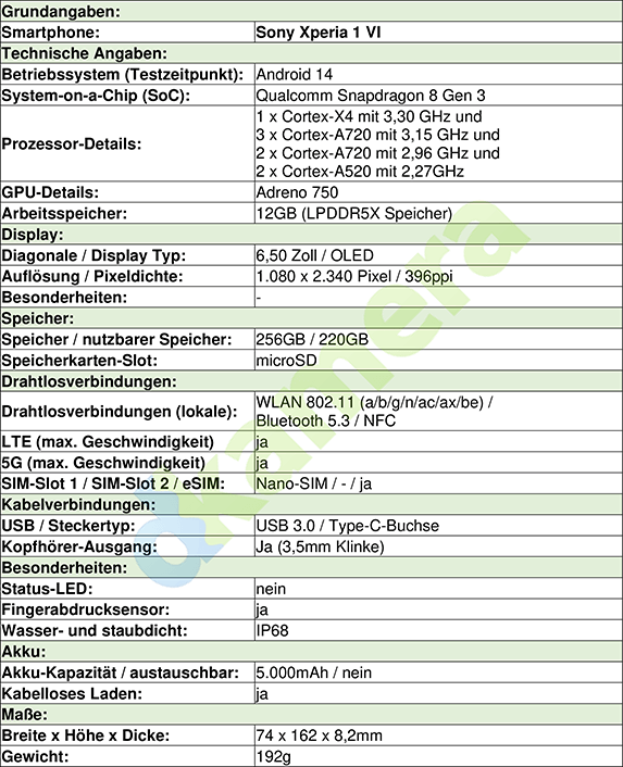Treu bleibt sich Sony bei der Wahl des SoC und verbaut den schnellsten aktuellen Qualcomm-Chip in Form des Snapdragon 8 Gen 3 mit acht Kernen (1 × Cortex-X4 mit 3,30 GHz, 3 × Cortex-A720 mit 3,15 GHz, 2 × Cortex-A720 mit 2,96 GHz und 2 × Cortex-A520 mit 2,27 GH) sowie der Adreno 750 GPU. Den Rechenwerken stehen 12GB LP-DDR5X-RAM zur Seite, der Speicher ist 256GB groß. Anders als bei praktisch allen Flaggschiff-Geräten am Markt lässt sich der Speicher zudem mittels einer microSD-Karte erweitern. Bis zu 1,5TB fassende Modelle können Besitzer des Smartphones einsetzen, das relativiert die hohe UVP des Gerätes von 1.399 Euro für „nur“ 256GB doch ein wenig. Mit an Bord ist beim Sony Xperia 1 VI zudem wieder ein 3,5mm-Klinkenanschluss für Kopfhörer. Wer kein drahtloses Modell nutzen möchte, kann beim Xperia 1 VI also auf einen USB-C-Adapter verzichten. Apropos USB: Der Port unterstützt den 3.2 Gen 1x1-Standard und erlaubt das Aufladen des Akkus mit bis zu 30 Watt. Drahtlos kommt man auf die Hälfte davon. Das 162 x 74 x 8,2mm große Gehäuse bringt 192g auf die Waage und widersteht Staub und Wasser (IP68), Android 14 ist als Betriebssystem vorinstalliert. Die Update-Garantie liegt bei drei (Feature-Updates) bzw. vier Jahren (Sicherheits-Updates).