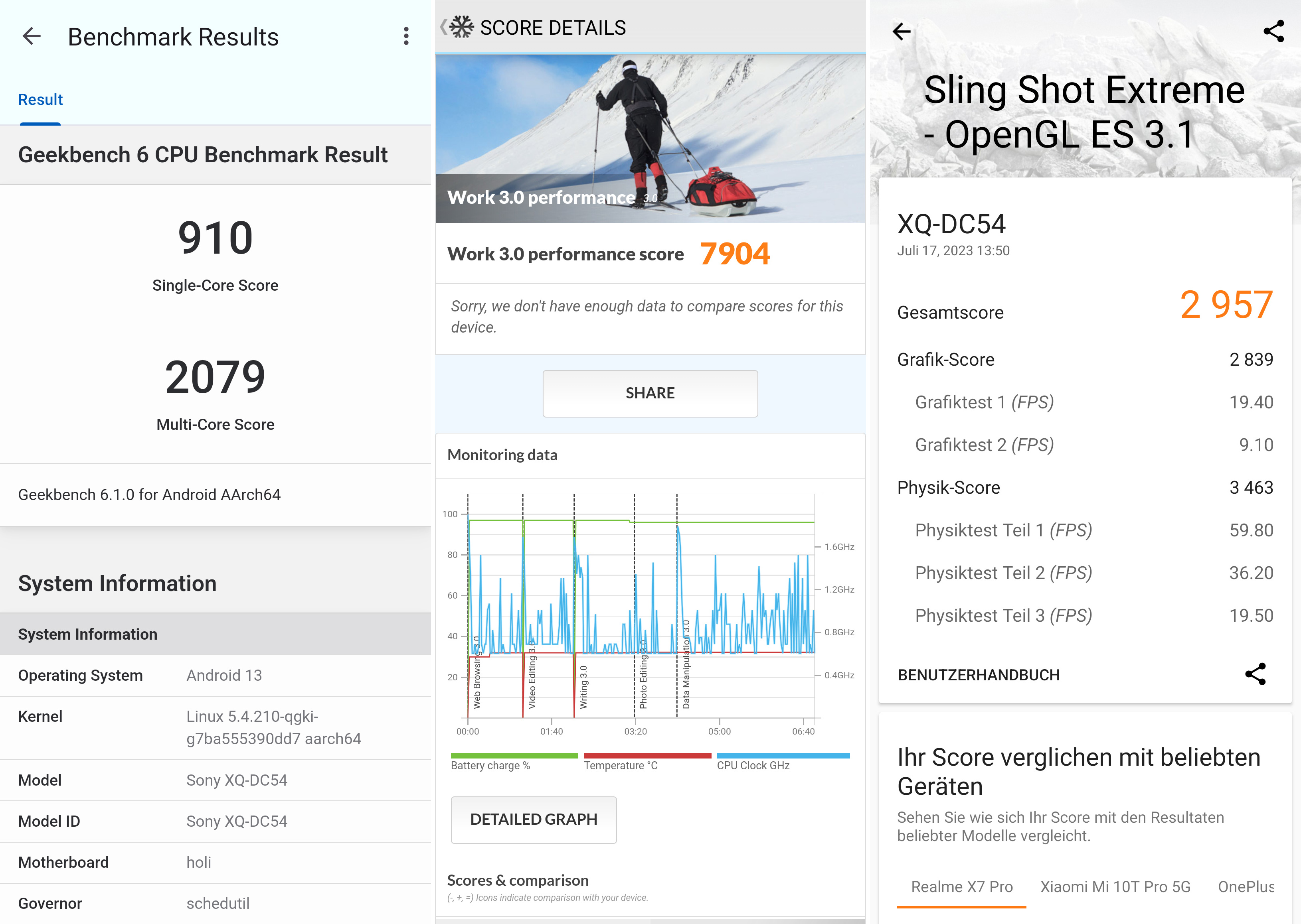 Als Smartphone der Mittelklasse ist das Sony Xperia 10 V zwar nicht mit der aktuellsten Hardware ausgestattet, für die allermeisten Aufgaben sollte diese aber problemlos ausreichen. Der Qualcomm Snapdragon 695 5G erreicht 2.957 Punkte beim Sling Shot Extreme des 3D Mark, 7.904 Punkte beim PC Mark Work 3.0 Performance Score und 910 (Single-Core Score) bzw. 2.079 Punkte (Multi-Core Score) beim Geekbench 6.