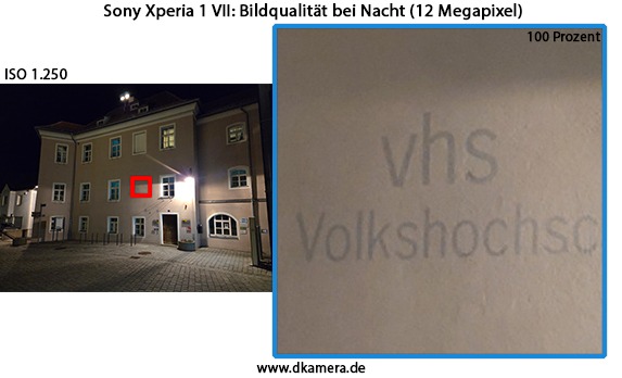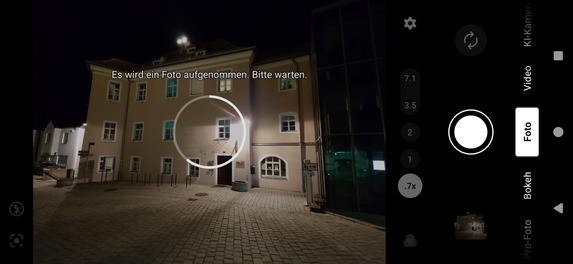 Wenig Licht ist für moderne Smartphones in aller Regel keinerlei Problem mehr. Die vergleichsweise kleinen Sensoren erreichen durch Soft- und Hardware-Tweaks mittlerweile eine sehr hohe Qualität. Zum Verbessern der Bildqualität setzt Sony wie alle anderen Smartphone-Hersteller auf die Kombination mehrerer Einzelbilder. Auf einen extra Nachtmodus wird dabei leider verzichtet, diesen aktiviert das Smartphone bei Bedarf automatisch. Wie groß die Vorteile gegenüber klassischen Fotos sind, lässt sich daher nicht genau bestimmen. Nimmt man die JPEG-Fotos des Pro-Modus als Vergleich, sind die Vorteile jedenfalls sofort sichtbar. Die Aufnahmen mit der höchsten Qualität liefert bei Nacht natürlich die Hauptkamera, der vergleichsweise große Sensor der Ultraweitwinkelkamera ermöglicht aber ebenso gute Bilder. Die Telekamera ist bei wenig Licht schwächer, das Bildrauschen fällt sichtbar höher aus.