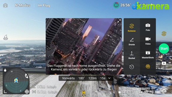 Wer die Steuerung der Drohne nicht selbst übernehmen möchte, kann sich für eine Reihe von Software-Features entscheiden. Dazu gehören natürlich die bekannten Flugmanöver, die automatisiert vorgenommen werden. Als Beispiele sind hier die Quickshots „Drohnie“, „Rocket“ oder „Boomerang“ zu nennen. Daneben werden die sogenannten Mastershots unterstützt, die das Abfliegen vorgegebener Positionen bzw. Routen erlauben.