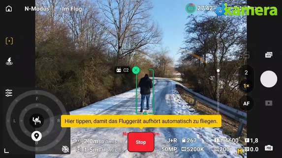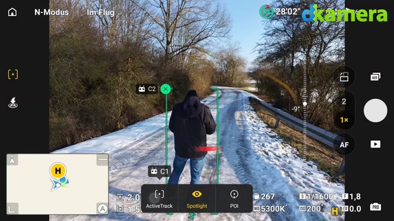 Will man sich selbst, eine andere Person oder einen Gegenstand verfolgen, gibt es das Tool Focus Track. Dieses besteht aus den Modi „POI“, „Spotlight“ und „Active Track“. Per „POI“ (Point of Interest) kann man einen Gegenstand oder eine Person unter anderem automatisch umrunden lassen, die Spotlight-Funktion verfolgt ein Motiv. Dabei ändert sich die Position der Drohne allerdings nicht, sondern nur die Blickrichtung der Kamera. Soll Ersteres der Fall sein, muss man zur ActiveTrack-Funktion greifen. Hier folgt die Mini 5 Pro Motiven ohne das Zutun des Piloten. Die Auswahl des Motives erfolgt bei allen Funktionen sehr einfach per Touch, die Motiverkennung der Kameradrohne unterstützt den Piloten grundsätzlich sehr gut.