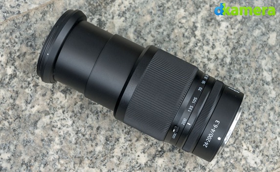 Den ungefähren Brennweitenbereich kann man an der Optik dank Markierungen für 24mm, 35mm, 50mm, 70mm 105mm, 135mm und 200mm sehr gut ablesen, für die maximale Zoomstellung muss man den Zoomring um etwas mehr als 90 Grad drehen. Der Tubus fährt mit einem zweifachen Auszug aus dem eigentlichen Gehäuse heraus, durch diese Konstruktion konnten die bereits angesprochenen kompakten Abmessungen realisiert werden. An der Stabilität sind keine Abstriche hinzunehmen, alle Teile bewegen sich nicht mehr als sie sollten. Der Einsatz bei leichtem Regen oder auch in staubigen Umgebungen stellt wegen der Abdichtungen keine Probleme dar.