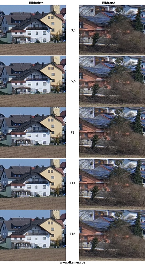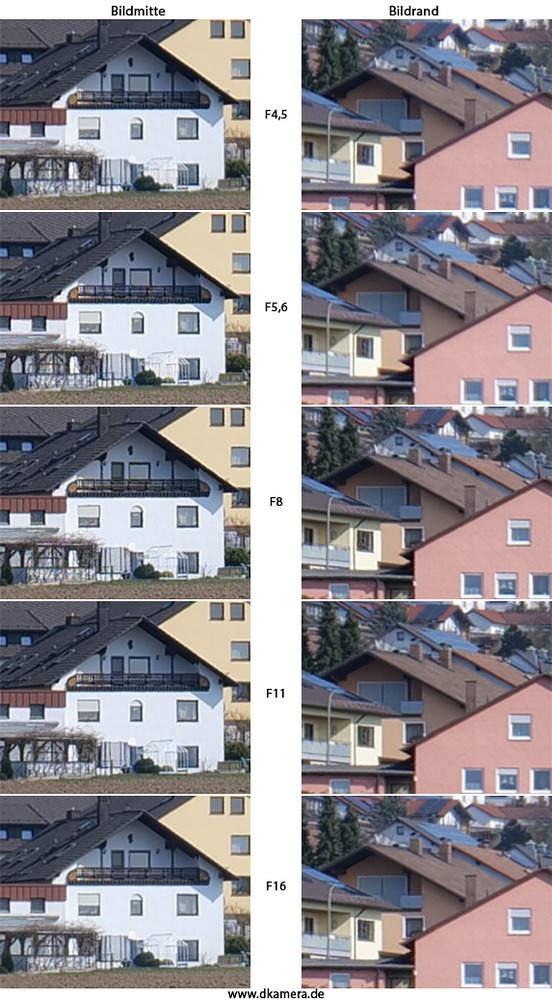 Bei 35mm fallen die Unterschiede von der Offenblende zum abgeblendeten Zustand kleiner aus. Im Zentrum wird bei F4,5 ein gutes Qualitätsniveau erreicht, bei F5,6 ein sehr gutes. Das Schärfe-Optimum sehen wir wieder bei F8, danach wird die Detailwiedergabe wegen der einsetzenden Beugung wieder schlechter. Die Ränder sind bei F4,5 nicht perfekt, aber gut. Bei F5,6 ändert sich nur wenig, bei F8 stufen wir die Qualität als sehr gut ein.
