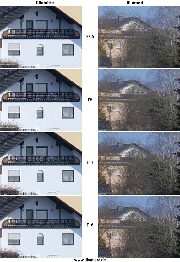 Bei 20mm schneidet das Objektiv im Zentrum schon bei Offenblende gut ab, wie bei nahezu allen Kitobjektiven lässt dich durch Abblenden aber noch etwas mehr herausholen. Bei F4 ändert sich nur wenig, bei F5,6 legt die Schärfe deutlicher zu. Bei F8 hält sich die Verbesserung in Grenzen, über F11 sollte man wegen der Beugungsunschärfe nicht hinaus gehen. Am Rand muss man bei F3,5 natürlich Abstriche machen, knackig scharfe Details darf man hier nicht erwarten. Die Ränder sind jedoch auch alles andere als schlecht, sondern zweifellos gut nutzbar. Bei F5,6 finden wir die Qualität am Rand dann gut bis sehr gut, ab F8 sehr gut. Weiteres Abblenden bringt keine Vorteile mehr.