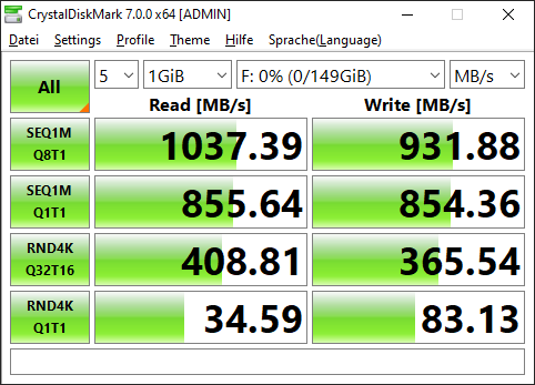 An einem USB 3.2 Gen 1-Port und mit dem USB-A-Kabel ergaben sich dagegen nur 1.037MB/s beim Schreiben und 932MB/s beim Lesen. Letztere Geschwindigkeiten sind in Relation zu anderen Speichermedien wie beispielsweise SD-Karte immer noch sehr flott, der Geschwindigkeitsnachteil liegt jedoch bei mehr als 600MB/. Das Kopieren von 100GB würde in letzterem Fall in etwa 100 Sekunden dauern, an einem USB 3.2 Gen 2x2-Port wären es nur rund 60 Sekunden.