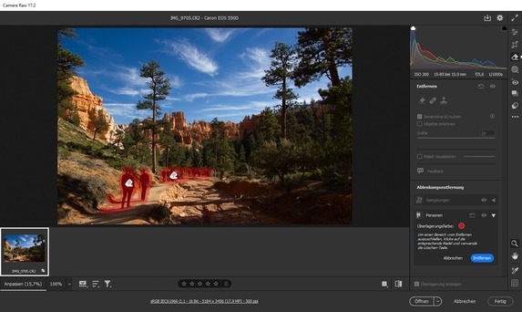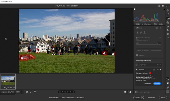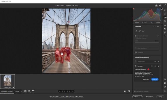 Im Gegensatz zur klassischen Entfernung von Personen kann man sich beim Einsatz der „Ablenkungsentfernung“ das manuelle Maskieren der Personen sparen. Camera RAW erstellt die Maske automatisch, wenn man die Option mittels des Pfeils „Personen“ im Entfernen-Menü anklickt. Daneben ist es möglich, bei Bedarf bestimmte Personen im Bild zu belassen. Dafür muss die Person per Pin ausgewählt werden. Nach der Finalisierung der Maske kann man auf „Entfernen“ klicken. Dann startet die generative KI-Entfernung. Sollte das Ergebnis nicht den Anforderungen entsprechen, lässt sich zum Originalbild zurückkehren.