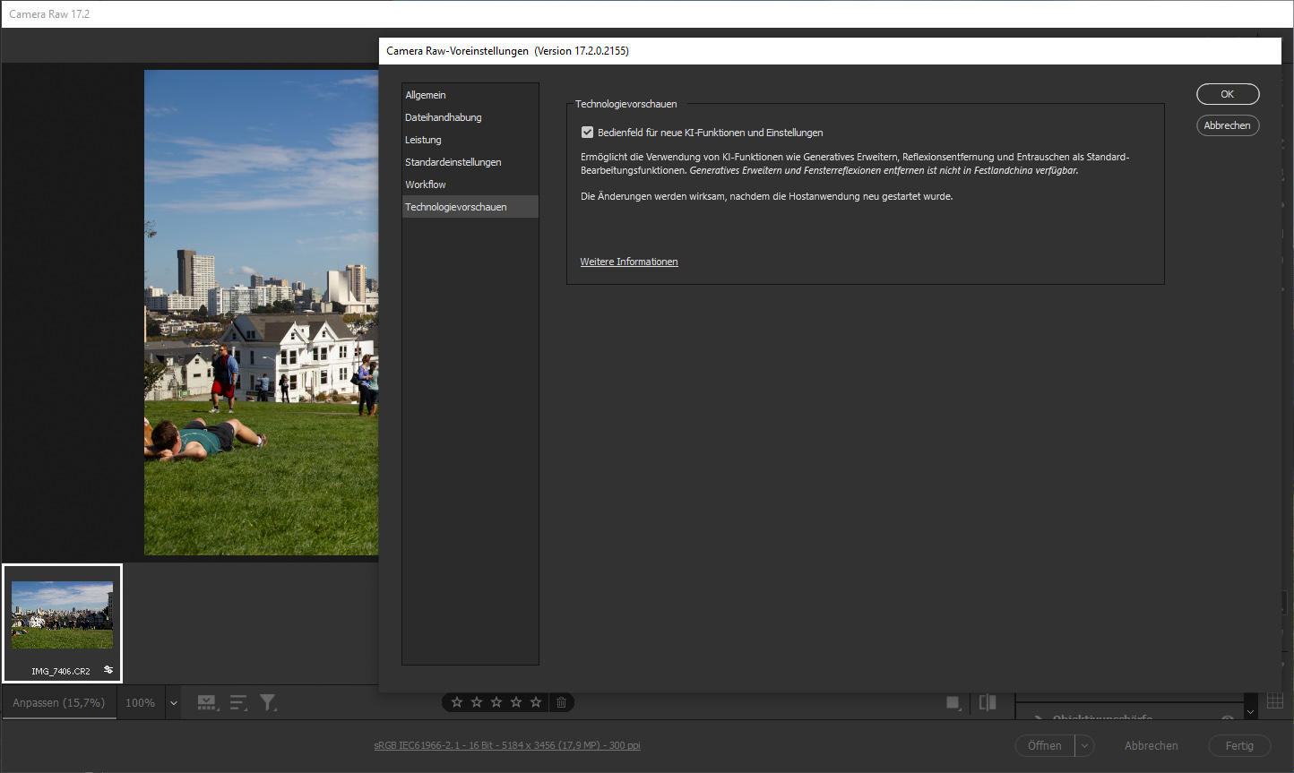 Adobe hat für die RAW-Bearbeitungssoftware Camera RAW das Update 17.2 herausgegeben. Neben der Unterstützung von mehreren neuen Kameras, Objektiven und Smartphones bringt das Update auch eine neue Funktion mit. Diese nennt sich „Ablenkungsentfernung“ und gehört zu den Technologievorschau-Features. Wer die neue Funktion nutzen möchte, muss daher zunächst die Technologievorschauen im Voreinstellungs-Menü aktivieren. Die neu hinzugekommene „Ablenkungsentfernung“ erkennt Personen laut Adobe automatisch und entfernt diese vom Bild.