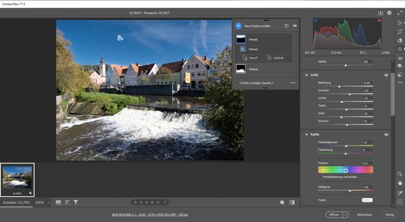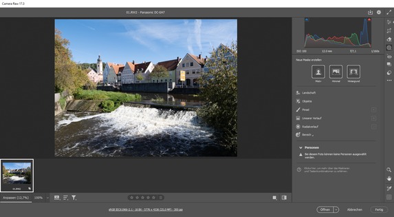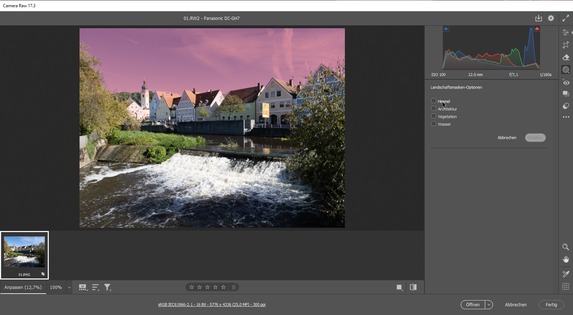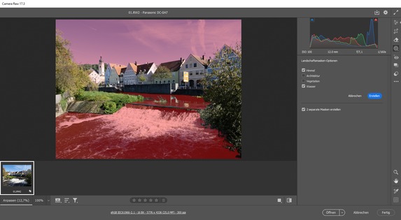 Lightroom Classic und Camera RAW erhalten eine neue Funktion zum Auswählen von Landschaften. Dazu ist beispielsweise bei Camera RAW im Bedienfeld „Maskieren“ eine neue Maske und danach die Option „Landschaft“ auszuwählen. Daraufhin kann man sich für die automatische Maskierung des Himmels, der Architektur, der Vegetation und des Wassers entscheiden. Im Test funktionierte dies bei großflächigeren Bereichen meistens sehr gut, bei Bäumen oder feinen Strukturen wurden die Masken aber nicht in jedem Fall fehlerfrei erstellt. Die Auswahl bestimmter Bildbereiche kann die neue Funktion aber zweifellos wesentlich vereinfachen.