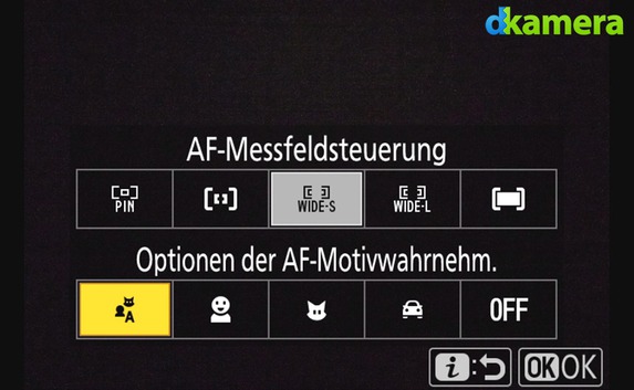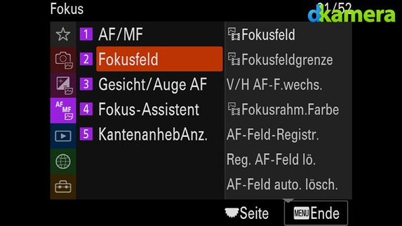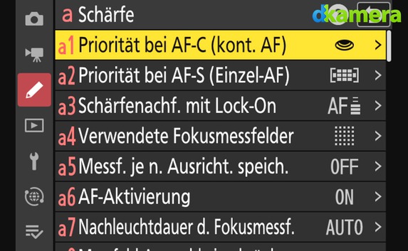 Das Angebot an AF-Optionen fällt bei allen drei Kameras extrem umfangreich aus. Dazu gehören diverse Messfeld-Optionen (automatische Wahl, Einzelfeld, Zonen-AF, …) und Empfindlichkeits-Einstellungen für die Verfolgung.