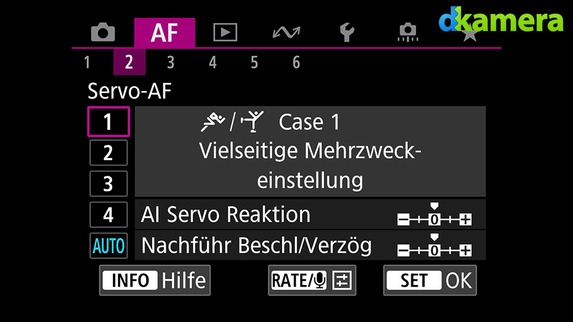 Diese befinden sich in eigenen AF-Menüs und können hierüber schnell verändert werden. Bei der EOS R3 kann man als Vorteil mehrere Einstellungen einem „Case“ zuordnen und zwischen unterschiedlichen „Cases“ schnell wechseln.