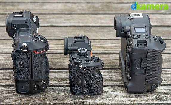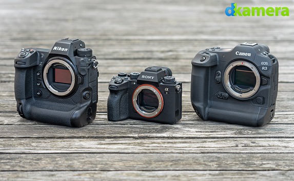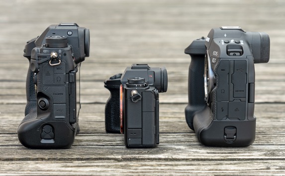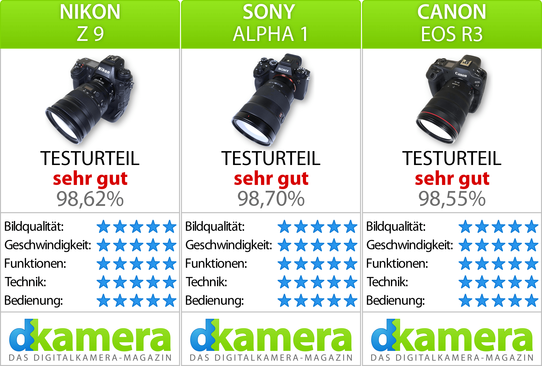 v.l.n.r.: Nikon Z 9, Sony Alpha 1 und Canon EOS R3.