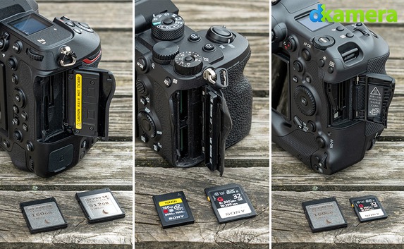 Bei der Datenspeicherung setzen die Hersteller auf unterschiedliche Ansätze. Nikon verbaut bei der Z 9 zwei CFexpress Tpy B-Slots, Canon setzt bei der EOS R3 auf einen CFexpress Typ B- und einen SD-Slot (UHS II). Sony wiederum verbaut zwei Kombi-Slots. In diesen lassen sich sowohl CFexpress Typ A- als auch SD-Karten (UHS II) einsetzen. Rein rechnerisch sind CFexpress Typ B-Karten mit 2.000MB/s in der Theorie und rund 1.700MB/s in der Praxis am schnellsten, in Kameras werden aktuell aber nur Werte unterhalb von 1.000MB/s erreicht. Diesen Wert wiederum schaffen CFexpress Typ-A-Karten in der Theorie, in der Praxis sind rund 800MB/s möglich.  In unserem Test erreichte die Nikon Z 9 beim Schreiben bis zu 829MB/s pro Sekunde, die Canon EOS R3 kam auf 651MB/s und die Sony Alpha 1 auf 632MB/s.