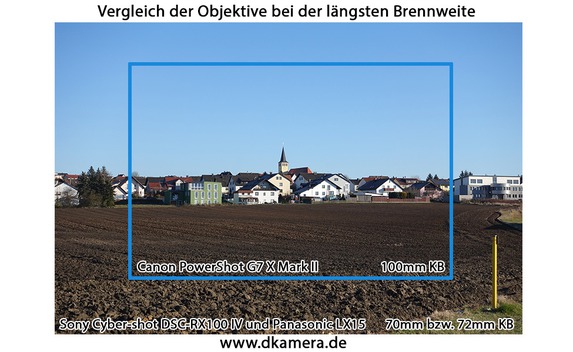Direkt vergleichbar ist letzterer Werte allerdings nicht. Während das Teleende bei der G7 X Mark II bei 100mm liegt, wird es bei der LX15 schon bei 72mm und bei der RX100 IV bei 70mm erreicht. Die Kamera von Canon hat somit den größten Zoombereich (4,2-fach) zu bieten, die LX15 (3,0-fach) und die RX100 IV (2,9-fach) liegen etwas dahinter.
