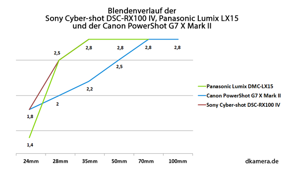 Wie die Grafik zeigt, ist die LX15 – effektiv gesehen – nur auf dem „Papier“ das lichtstärkste Modell. Die LX15 liegt mit F1,4 bei 24mm zwar um eine 2/3 Blendenstufe vorne, der Vorsprung löst sich beim Zoomen aber sprichwörtlich in Luft auf. Bei 28mm erreichen sowohl die LX15 als auch die RX100 IV nur noch F2,5, bei 35mm sind es F2,8. Deutlich besser schneidet die G7X Mark II ab: Bei 28mm kann man noch F2 nutzen, bei 35mm noch F2,2. F2,8 stellt erst ab 57mm KB-Brennweite die größte Blendenöffnung dar. Zum genaueren Vergleich: Die LX15 erreicht F2,8 bereits ab 31mm, die RX100 IV ab 33mm.