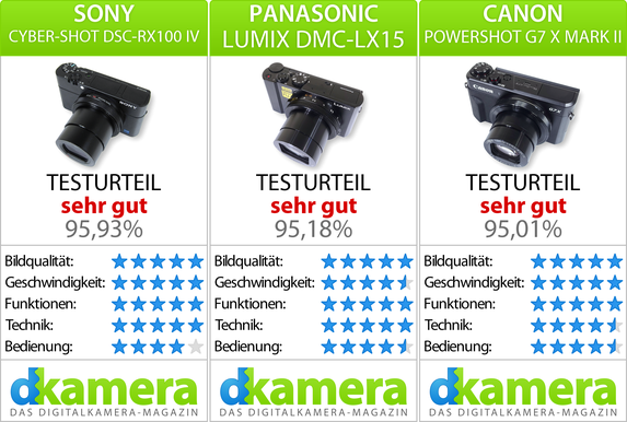 Dieser findet sich zudem bei der RX100 IV. Bei den speziellen Funktionen liegt die Panasonic Lumix DMC-LX15 vorne; sie speichert 30 Bilder pro Sekunde in 4K-Auflösung und erlaubt beispielsweise ein kamerainternes Fokus-Stacking. Bei Videos können sich die RX100 IV und die LX15 von der G7 X Mark II durch die 4K-Videoaufnahme absetzen, zudem ermöglichen sie Zeitlupenaufnahmen.