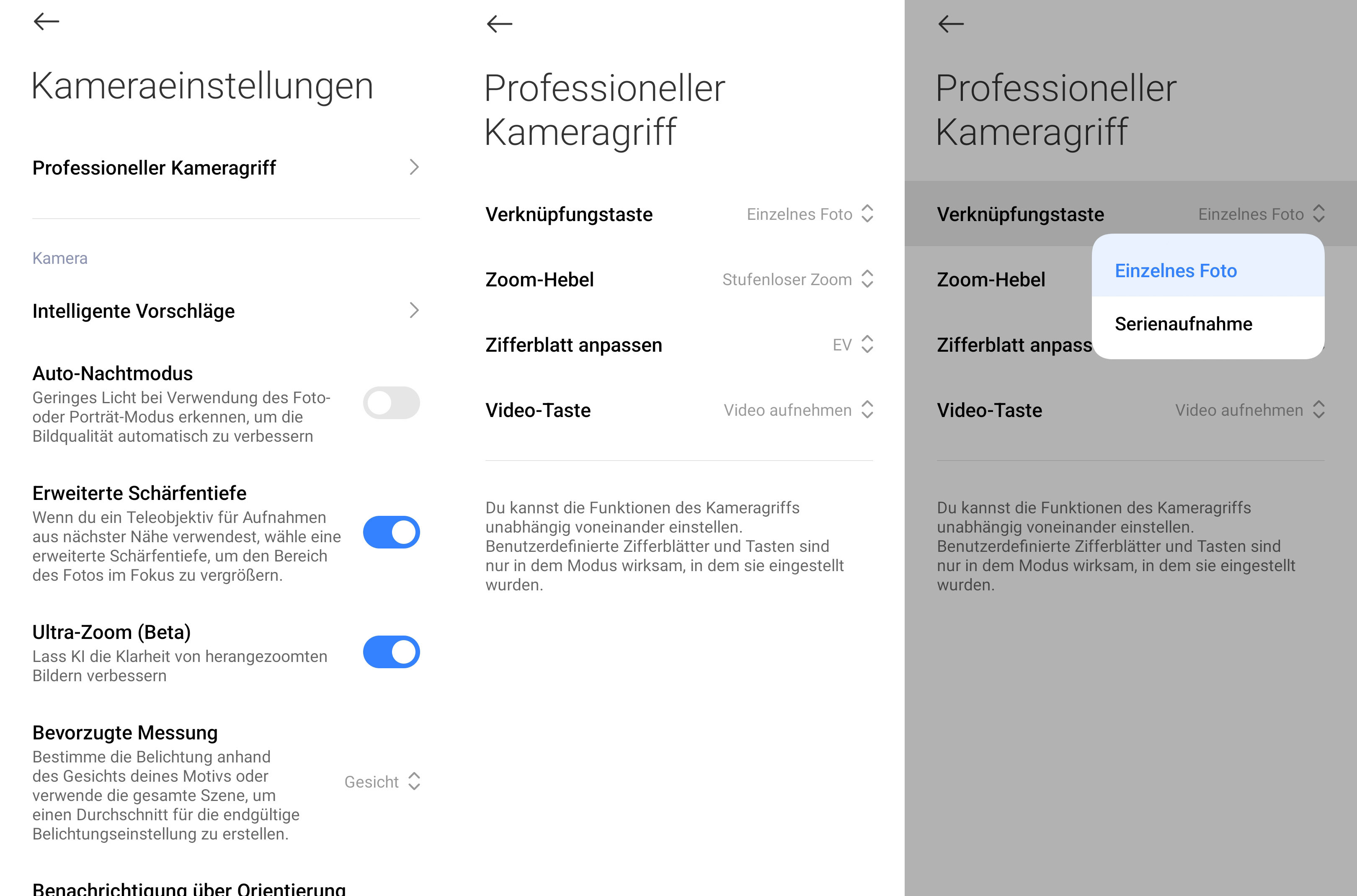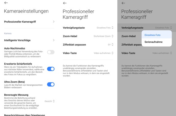 Verändern kann man die Parameterwahl in den App-Optionen unter „Professioneller Kameragriff“. Hier lässt sich zudem festlegen, welche Aktionen beim Drücken des Auslösers, beim Drehen des Einstellrades und beim Betätigen der Rec-Taste erfolgen sollen. Leider hat Xiaomi bei der Bezeichnung der Bedienelemente teilweise sehr merkwürdige Namen gewählt bzw. sich bei der deutschen Übersetzung nicht allzu viel Mühe gegeben. Der Auslöser ist beispielsweise die „Verknüpfungstaste“ und die Optionen für das Einstellrad verbergen sich hinter „Zifferblatt anpassen“.
