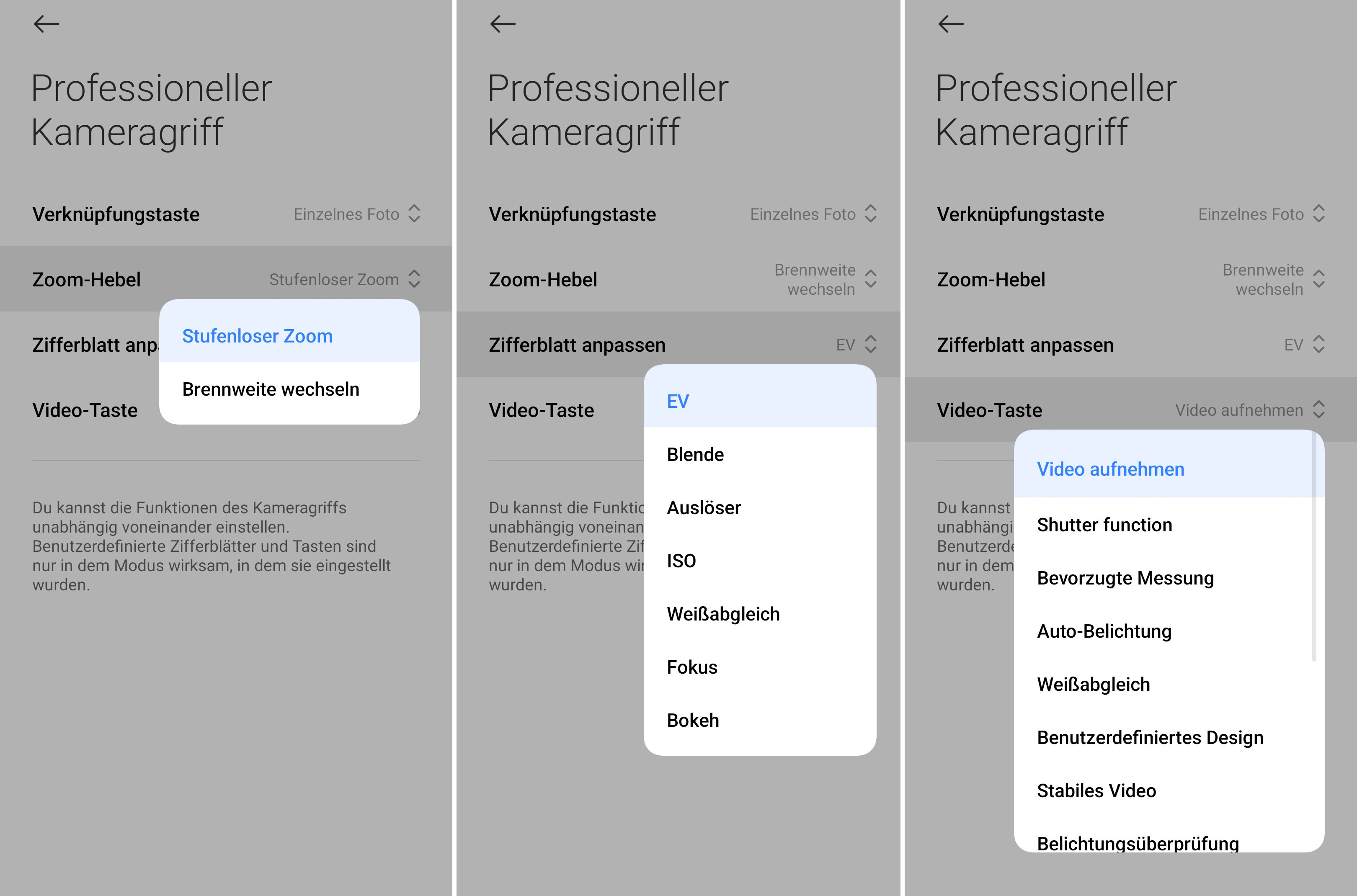 Nicht optimal sind auch die weiteren Einschränkungen. So muss man eine Einstellung immer für alle Aufnahmemodi vergeben, die Trennung nach Modi wäre jedoch deutlich sinnvoller. Dadurch kann man mit dem Professional Photography Kit als Beispiel die Blende im Pro-Modus verändern, im Fotomodus ist das Einstellrad dann aber ohne Funktion. Selbst das aktive Anwählen eines Parameters ändert das nicht. Wenig sinnvoll ist darüber hinaus, dass man im Foto- und Videomodus die Brennweite mit dem Zoomhebel ändern kann, im Pro-Modus allerdings nicht.