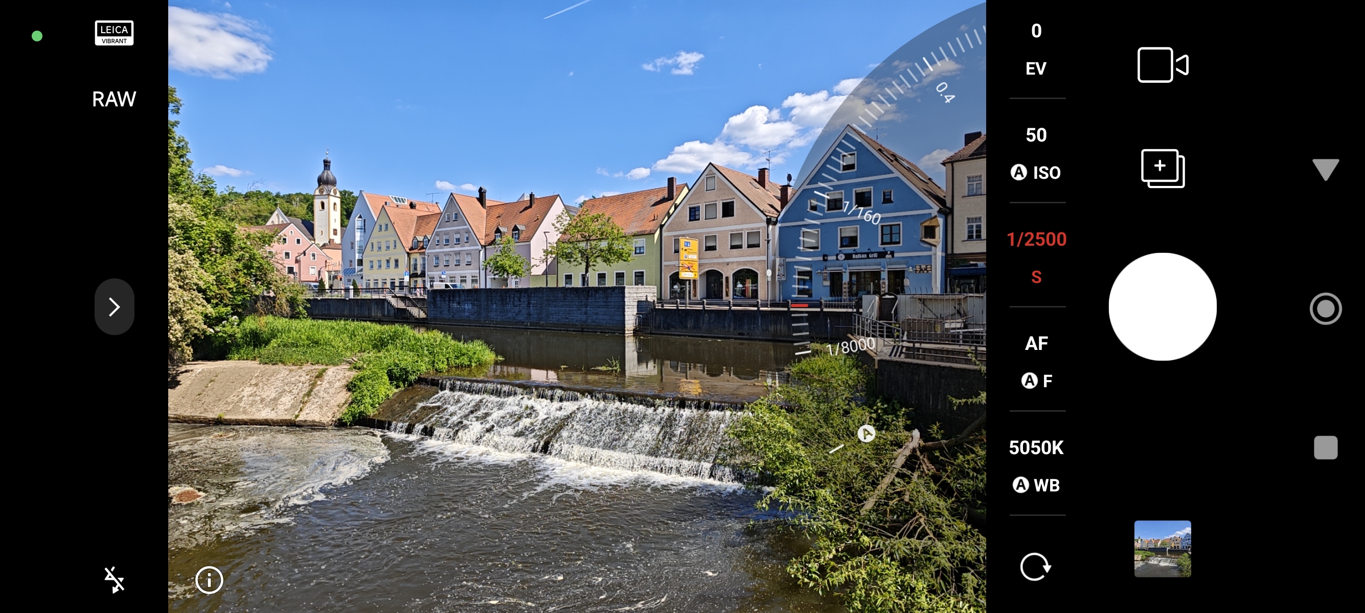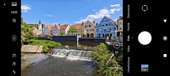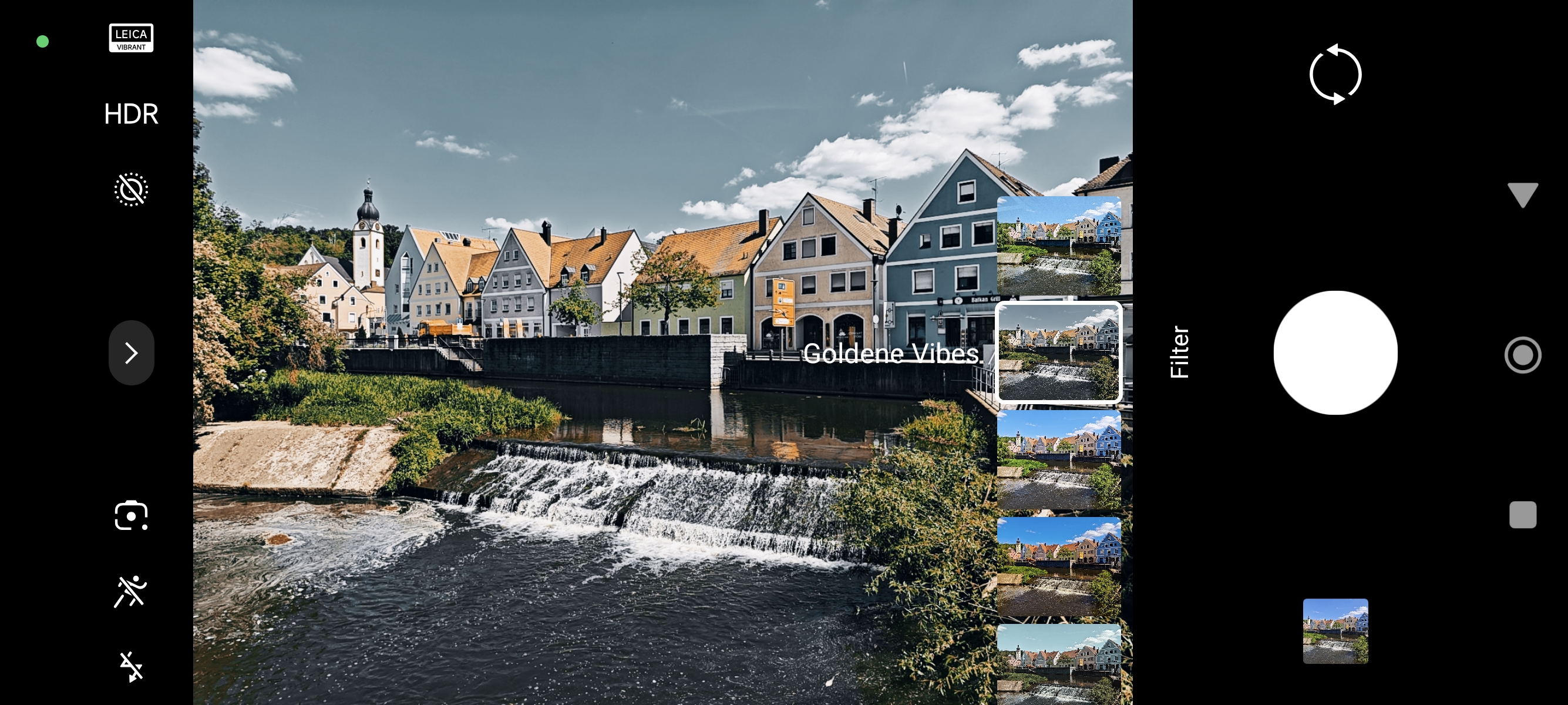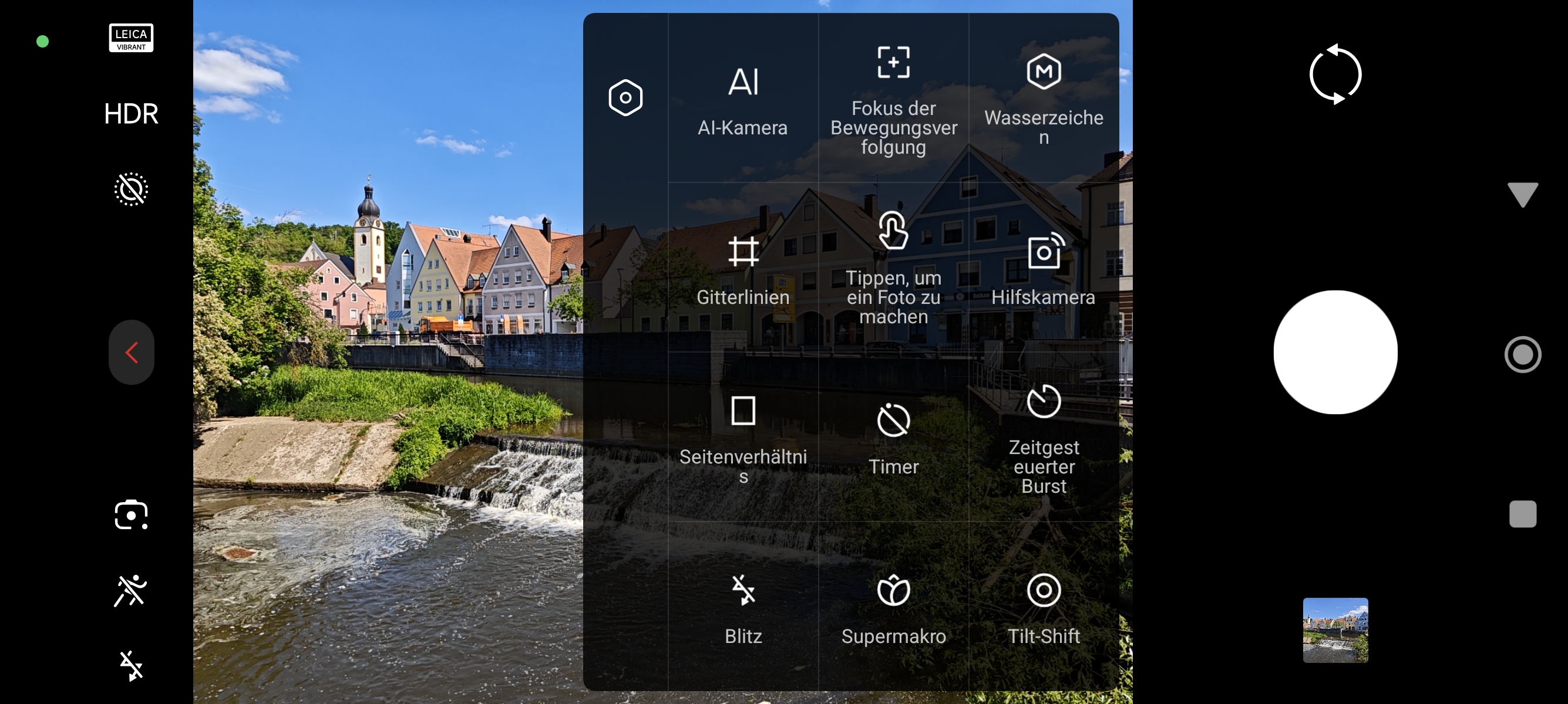 Hält man das Smartphone quer, sind auf der linken Seite unter anderem die Wahl des Farbprofils (Leica Vibrant oder Leica Authentic), die Aktivierung bzw. Deaktivierung des HDR-Modus oder auch die Steuerung des LED-Lichts möglich. Zur schnellen Motiverkennung gibt es zudem eine Taste für die „Google Lens“ und via Pfeil-Symbol gelangen Nutzer zu den weiteren Aufnahmeoptionen (Seitenverhältnis, Timer, AI Kamera, …).