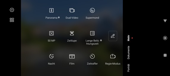 Rechts neben der Liveansicht lässt sich der gewünschte Fotomodus einstellen. Die Reihenfolge und Anordnung der Modi kann der Nutzer dabei individuell festlegen. Über den Punkt „Mehr“ gelangt man zu weiteren Aufnahmemodi. Ebenfalls am rechten Bildschirmrand befinden sich der Auslöser, ein Button zum Umschalten zwischen der Front- und der Rückkamera sowie eine Touchtaste für den Zugriff auf die Galerie.